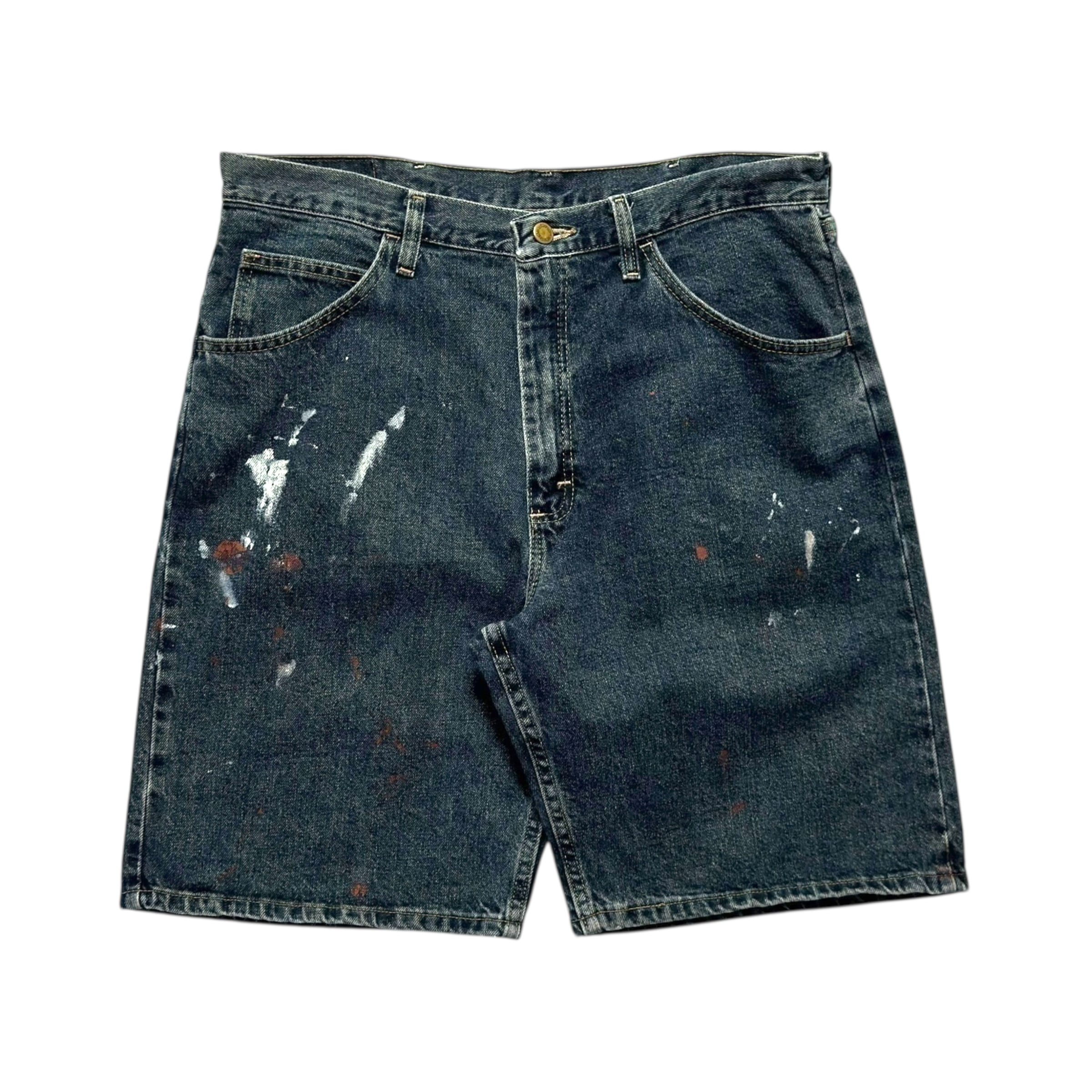 ラングラーのデニムショーツ。やや太めの膝丈で、ペンキ飛びも相まって雰囲気最高です。夏のお供に是非。