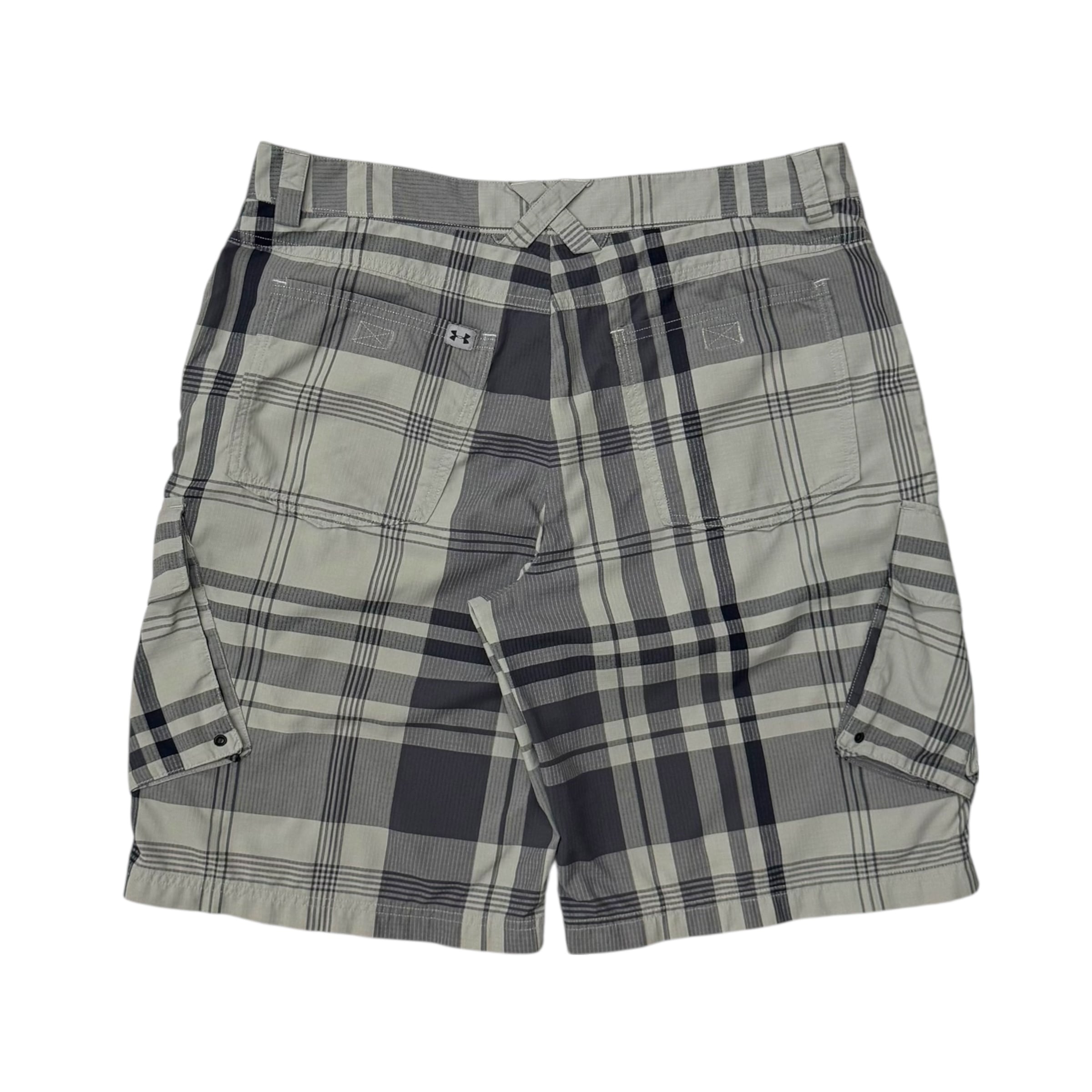 アンダーアーマーのチェック柄のカーゴショーツ。ナイロンリップストップ生地、斜めに付くカーゴポケットと小さいフラップポケット、ズドンと太いルーズフィット、膝下丈。最高です。今っぽく、ジャスト目のトップス合わせでどうぞ。