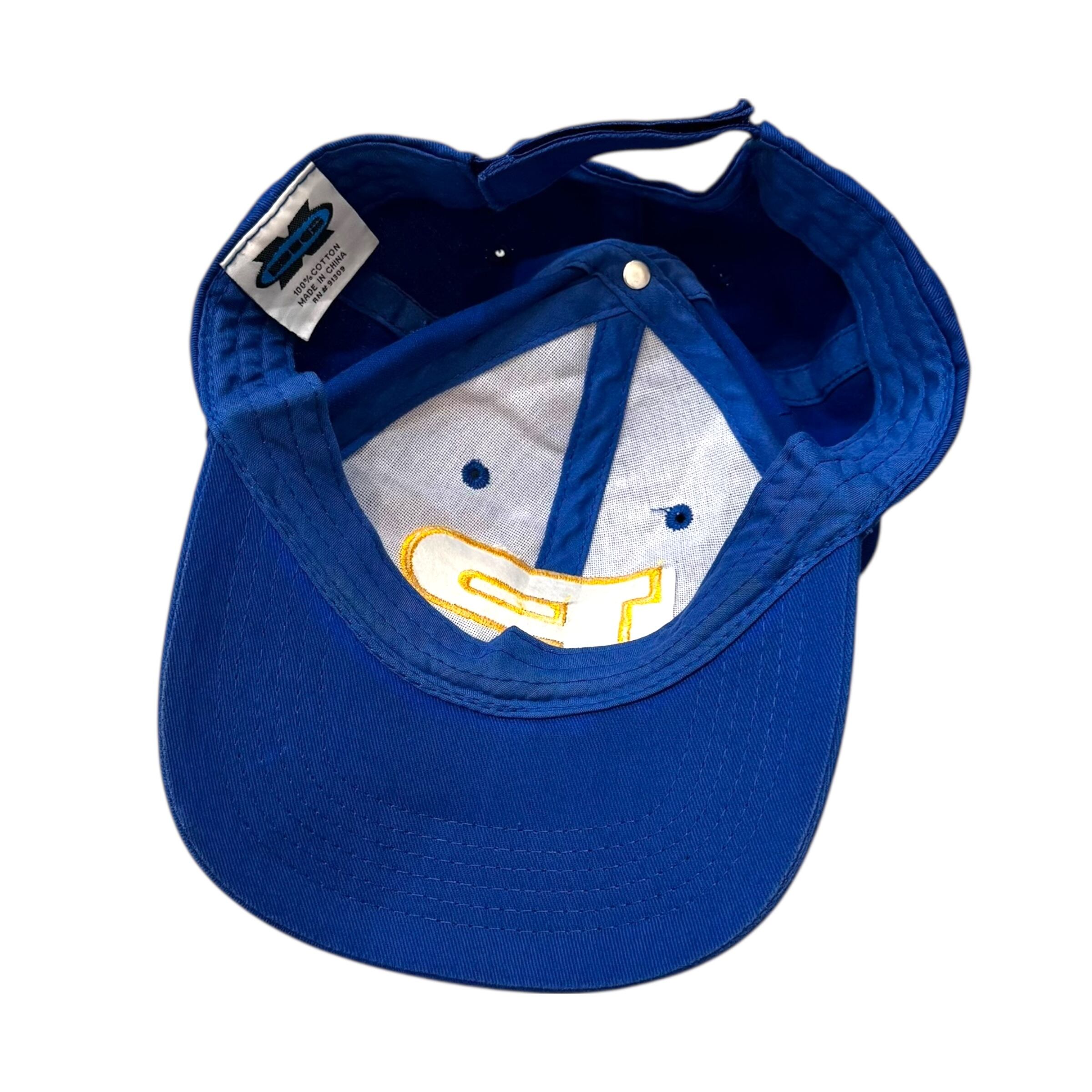 BIGの刺繍キャップ。ブルー×イエローの配色、横長でアウトラインのみの「P」ロゴ、芯入りのフロントパネル。良いです。「P」に関連のある方は是非。