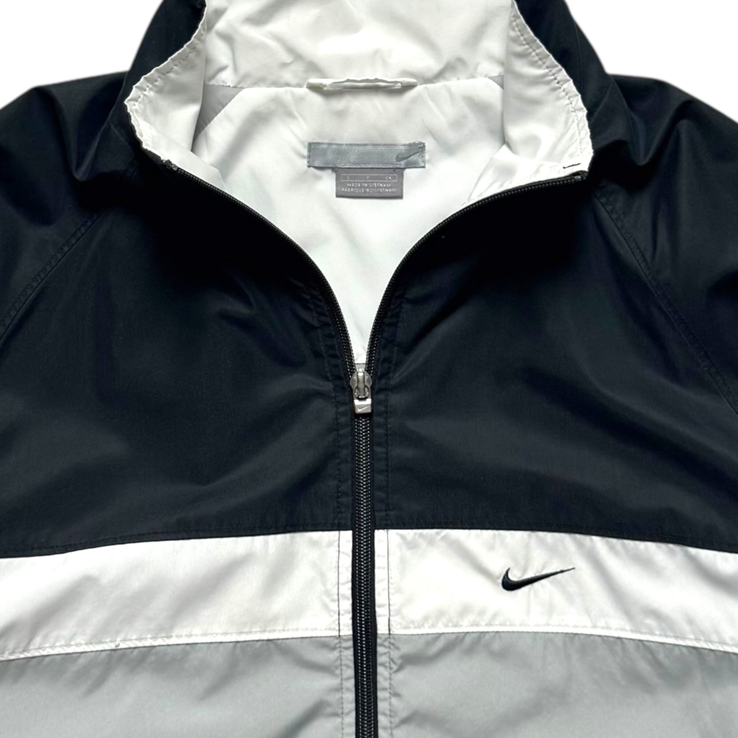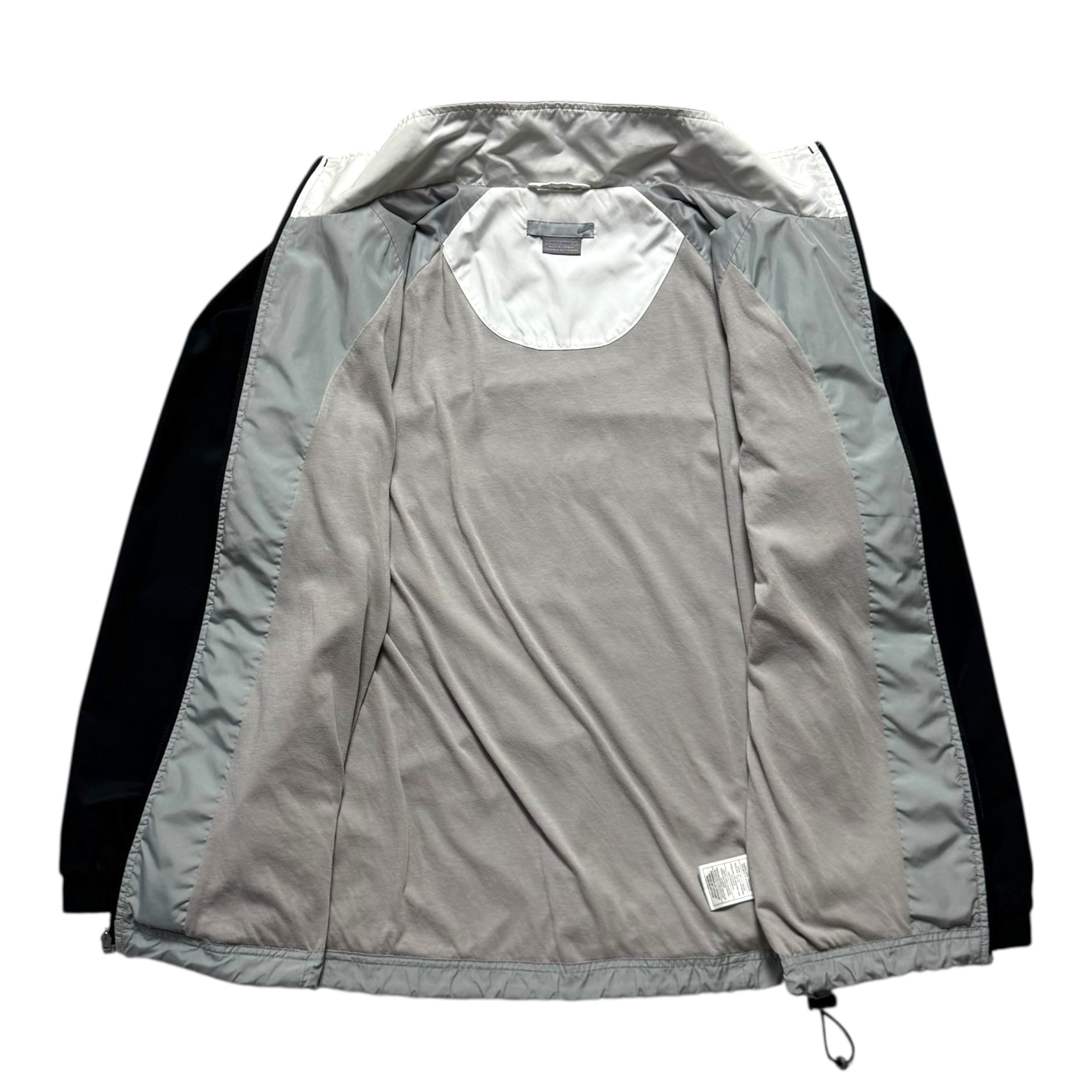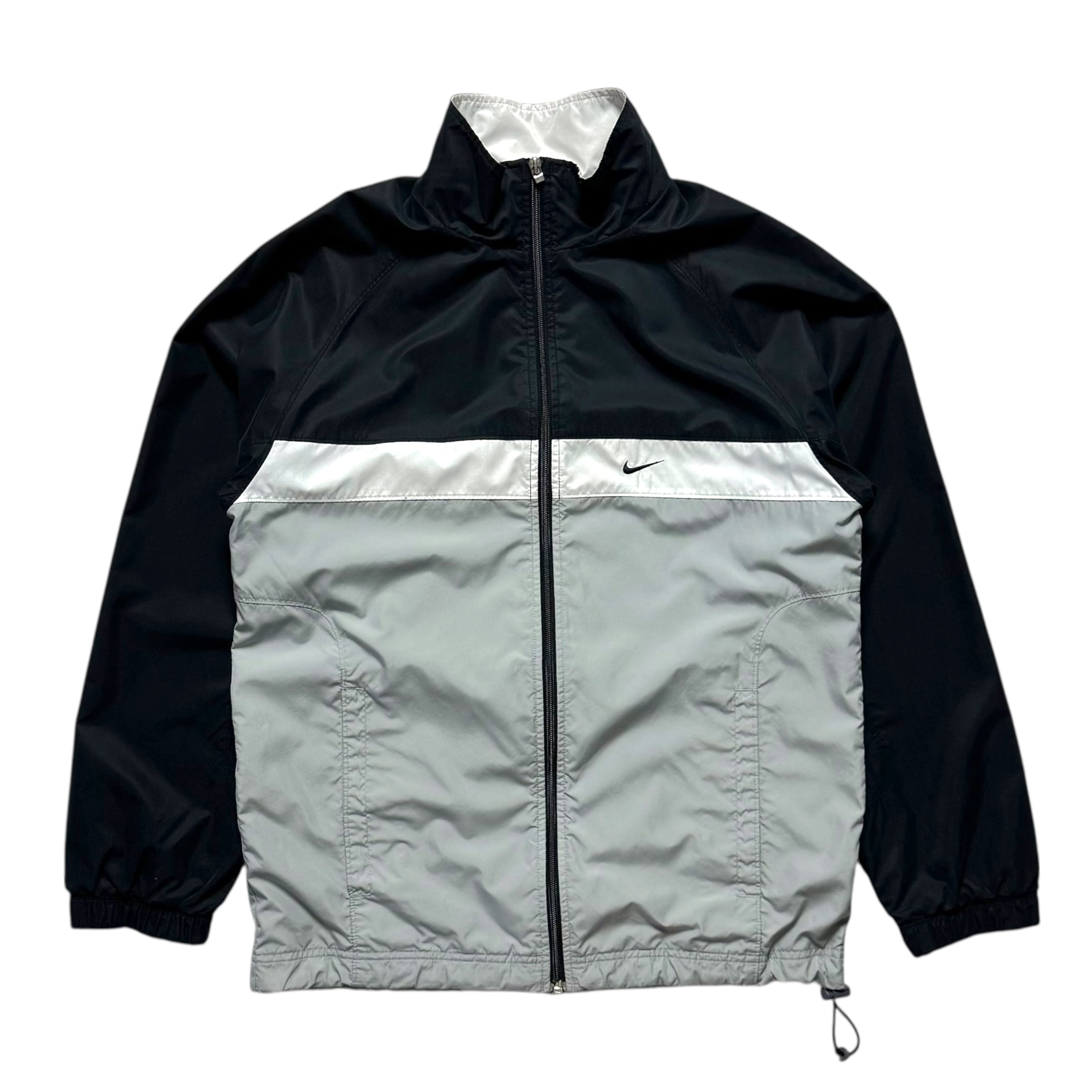 ナイキのフルジップのジャケット。間違いない配色のマルチカラー、ピーチスキン調のシェル、特徴的な切り替え。良いです。シンプルに見た目も好みです。嬉しいドローコード付き。