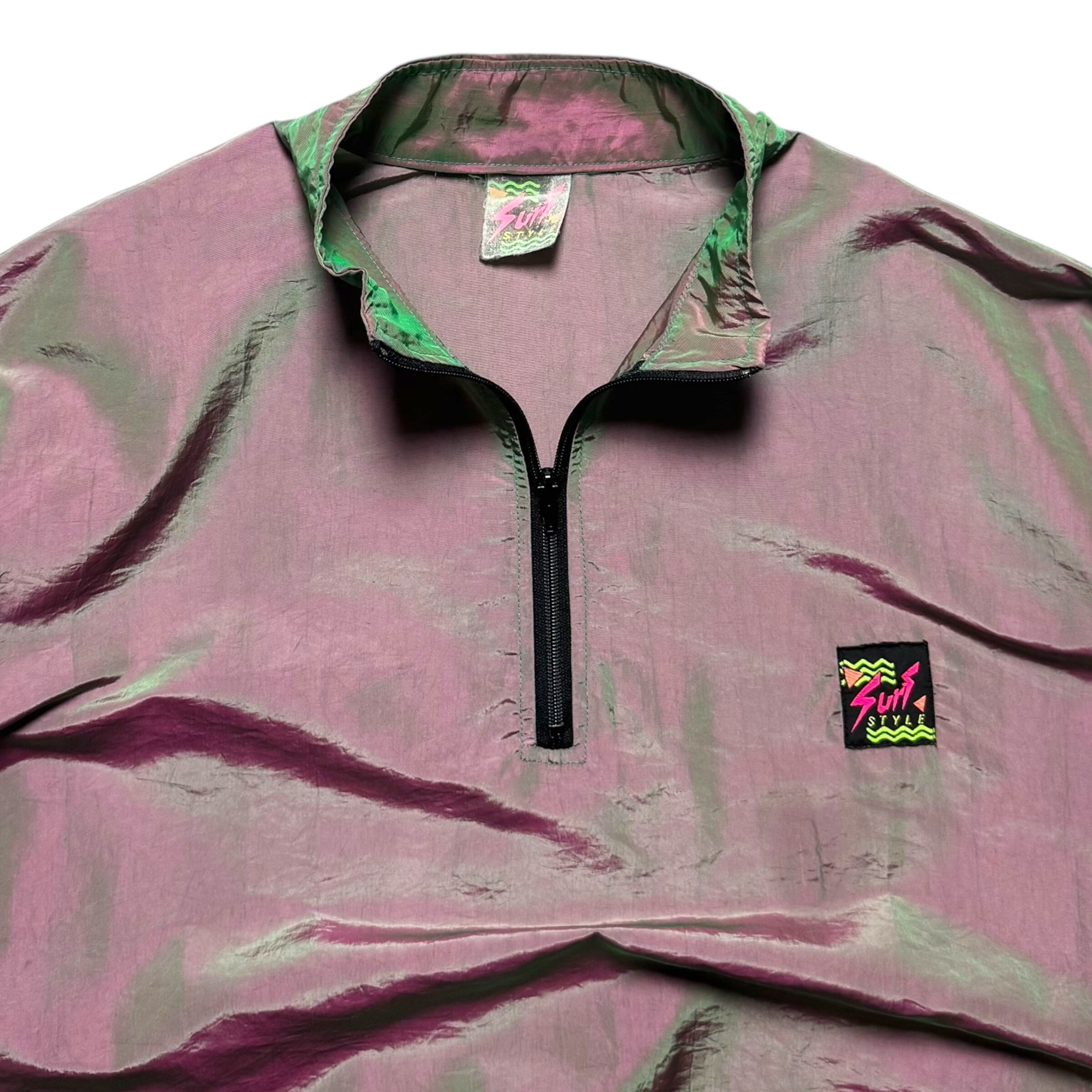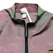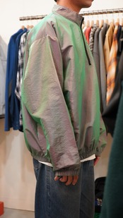 サーフスタイルの玉虫色のナイロンプルオーバー。久しぶりに見かけました。見る角度によって色味が変化します。良い意味でダサめのブランド名、まさかのワンサイズ(身幅は73cmあります)。最高です。