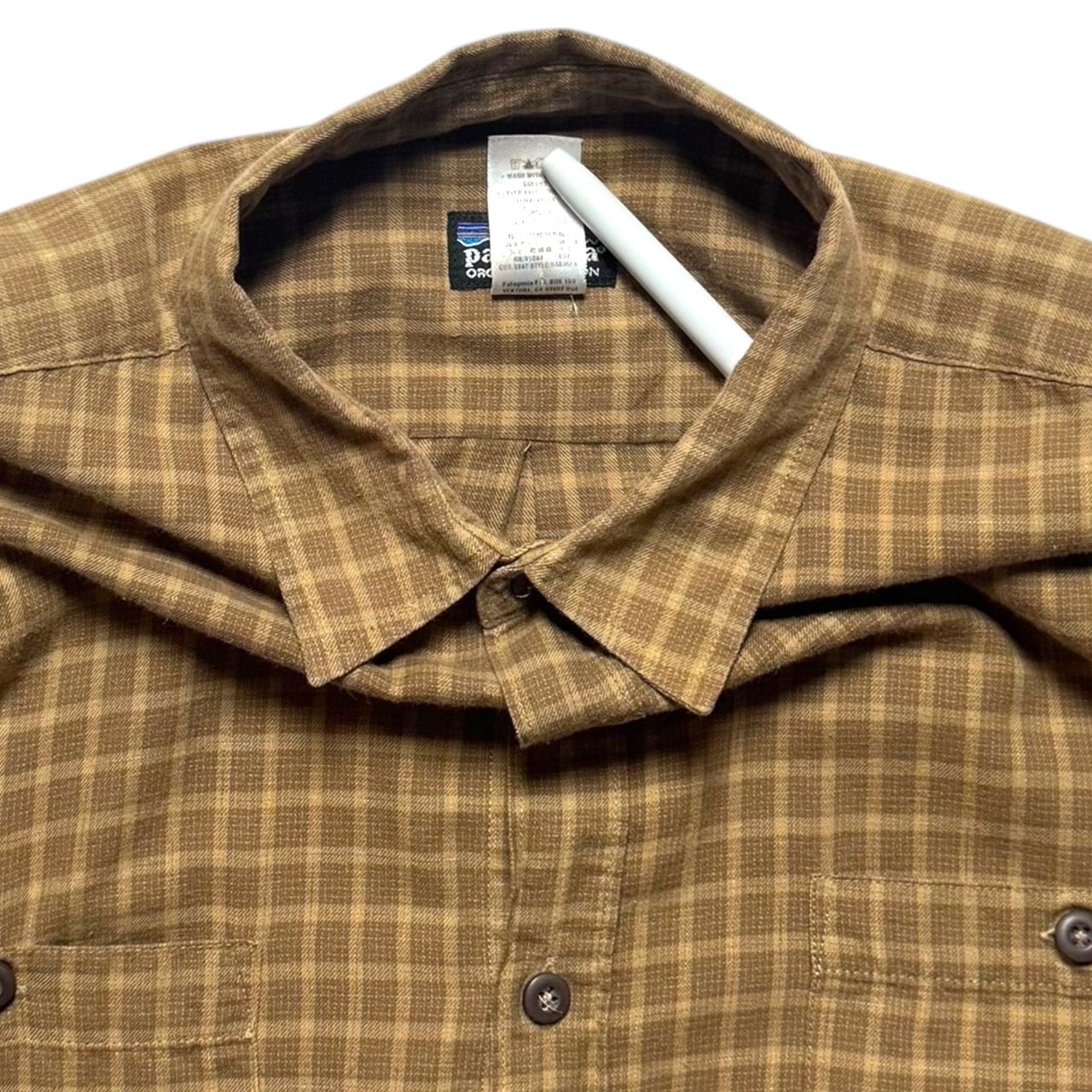 パタゴニアのチェックシャツ。秋らしい色味の細かいチェック、柔らかい肌触りのオーガニックコットン生地、レギュラーカラー。良いです。秋冬のお供に是非。