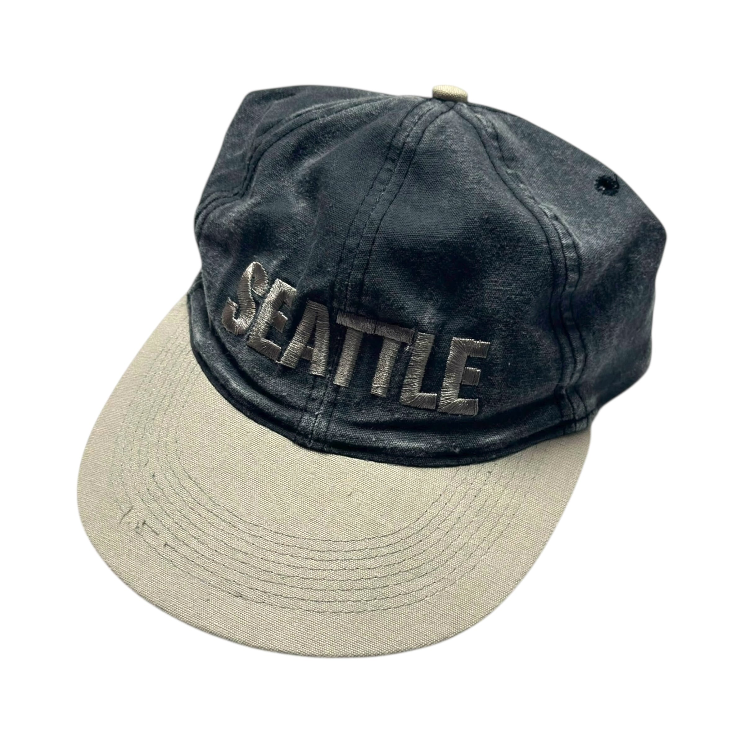 シアトルのスーベニアキャップ。ストーンウォッシュ加工による淡い色味、バイカラー、ワイドブリム。良いです。ビビッと来た方は是非。