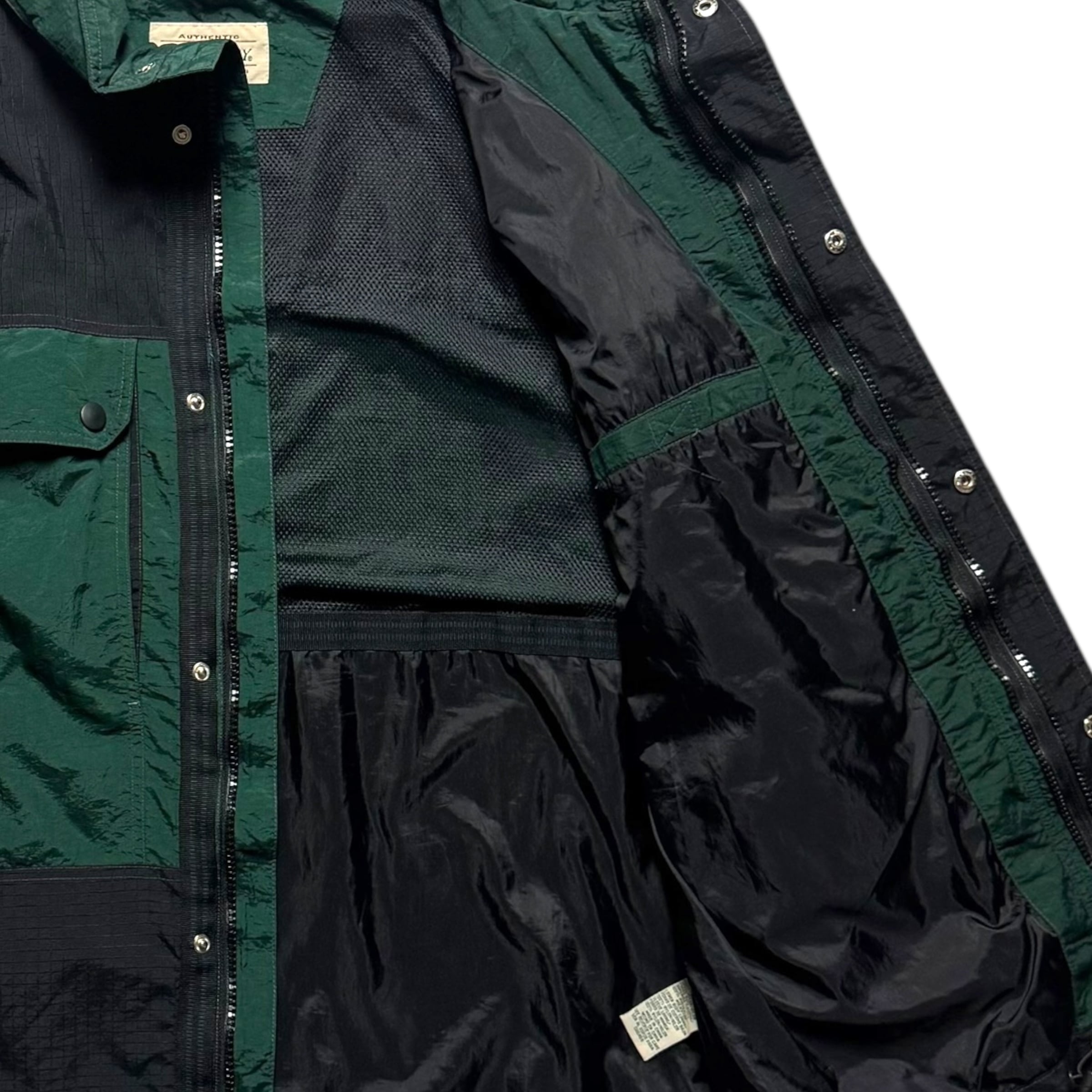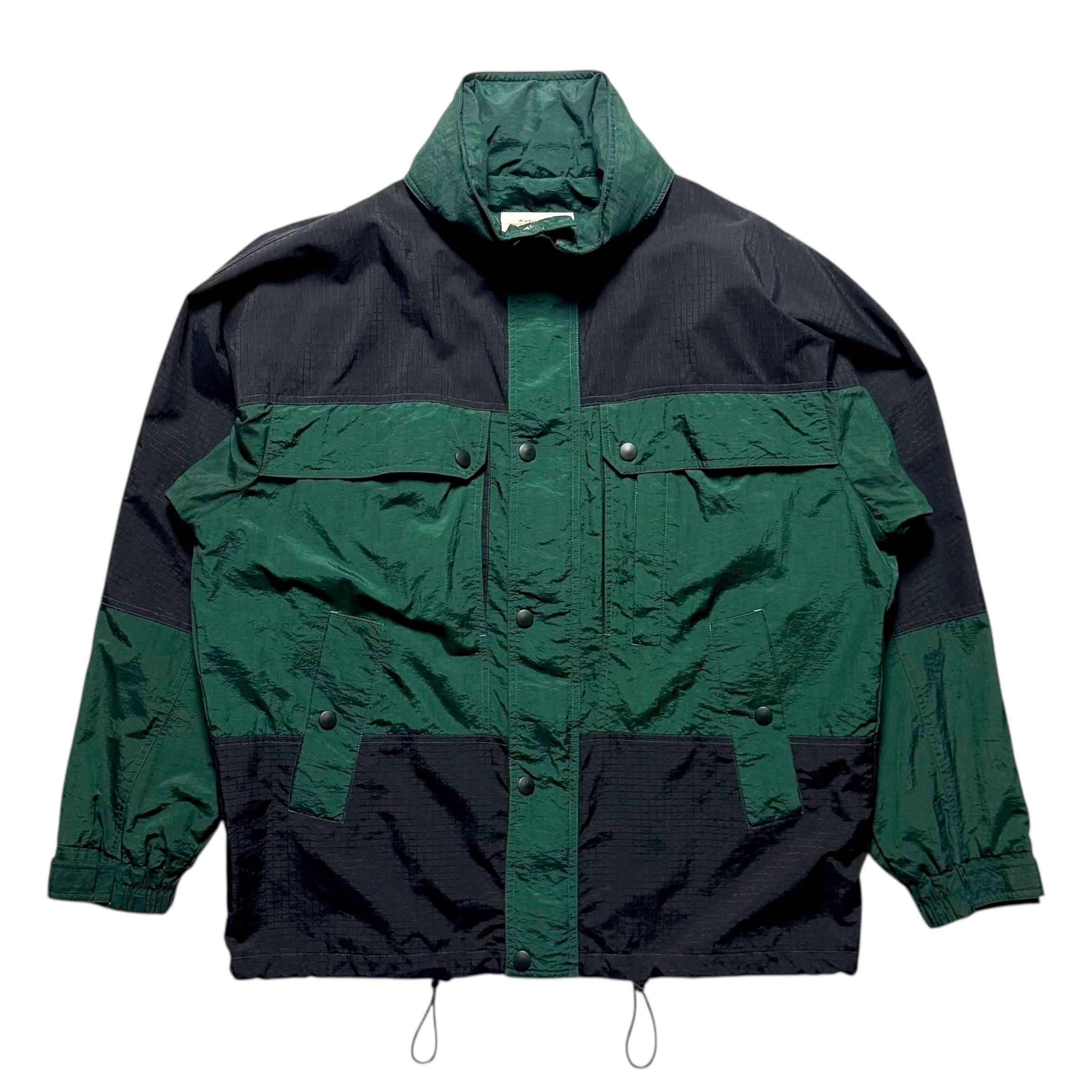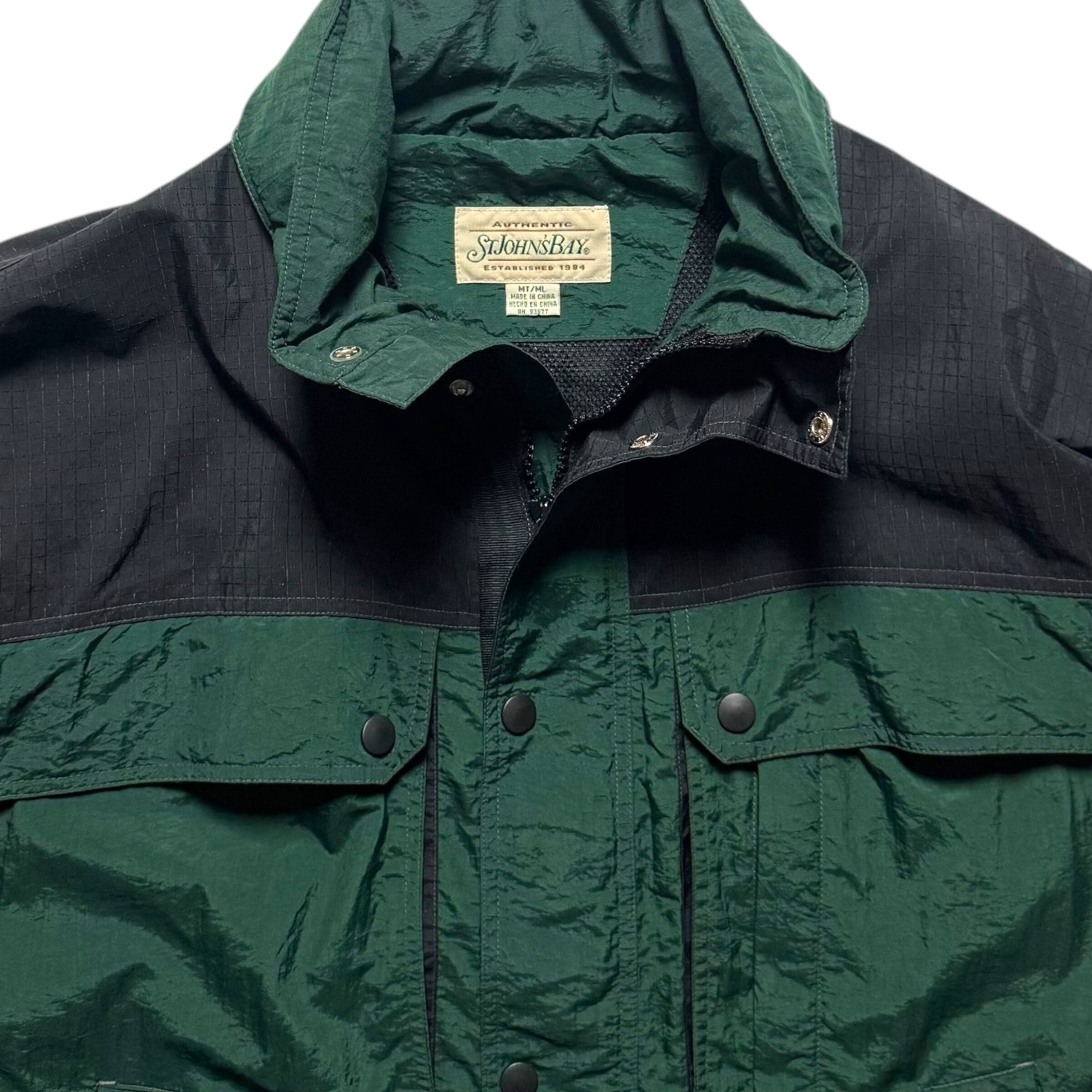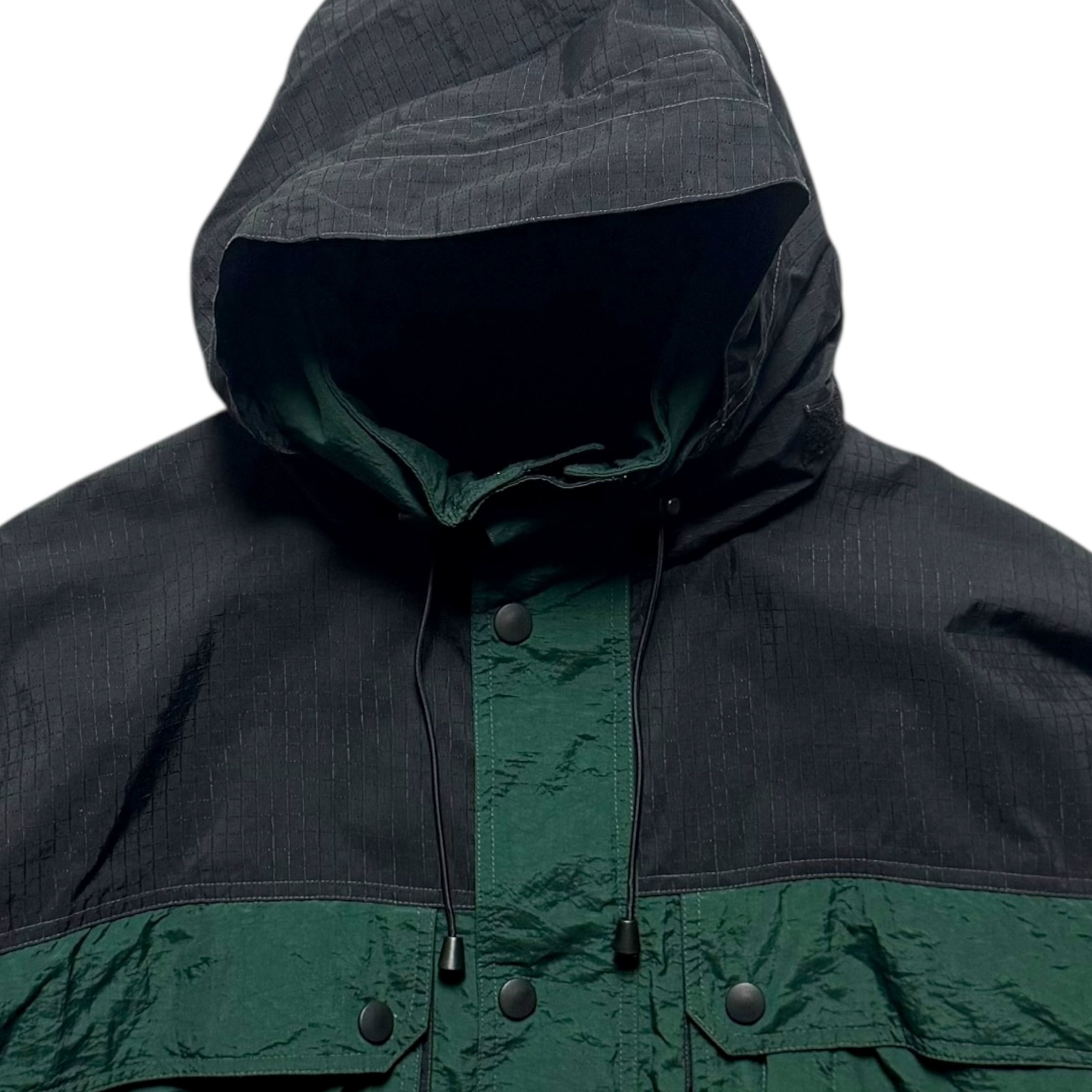 セントジョンズベイのバイカラーのマウンテンパーカー。シャリ感のあるナイロン生地にリップストップナイロンのあて生地。フードは襟に収納可能です。見ないディテールのマウンパかと。オススメです。