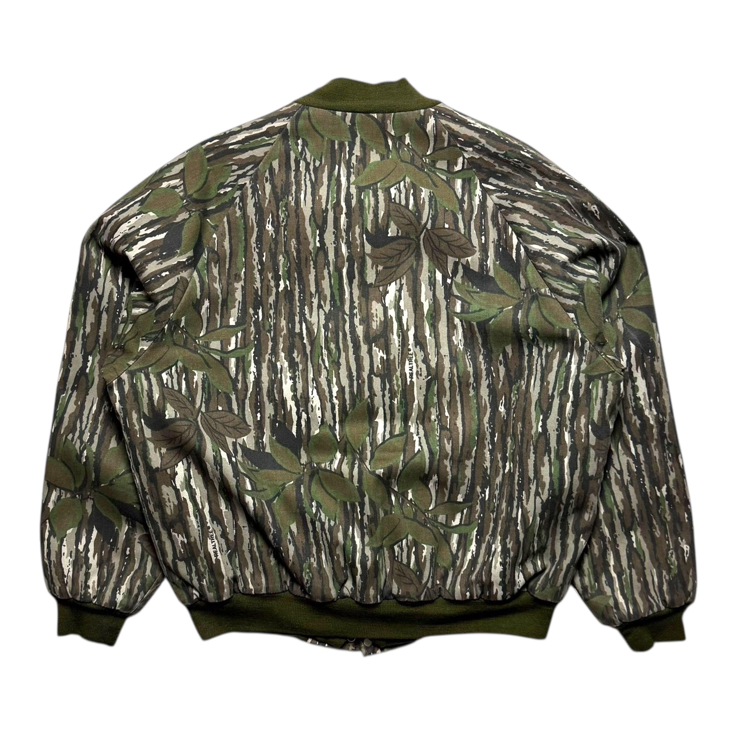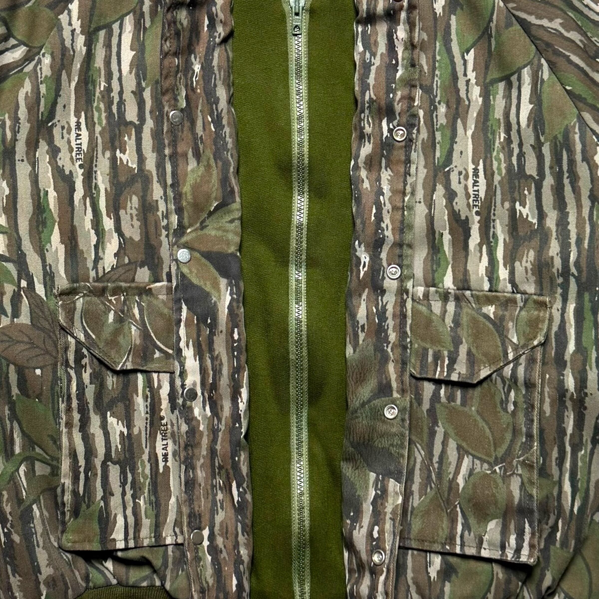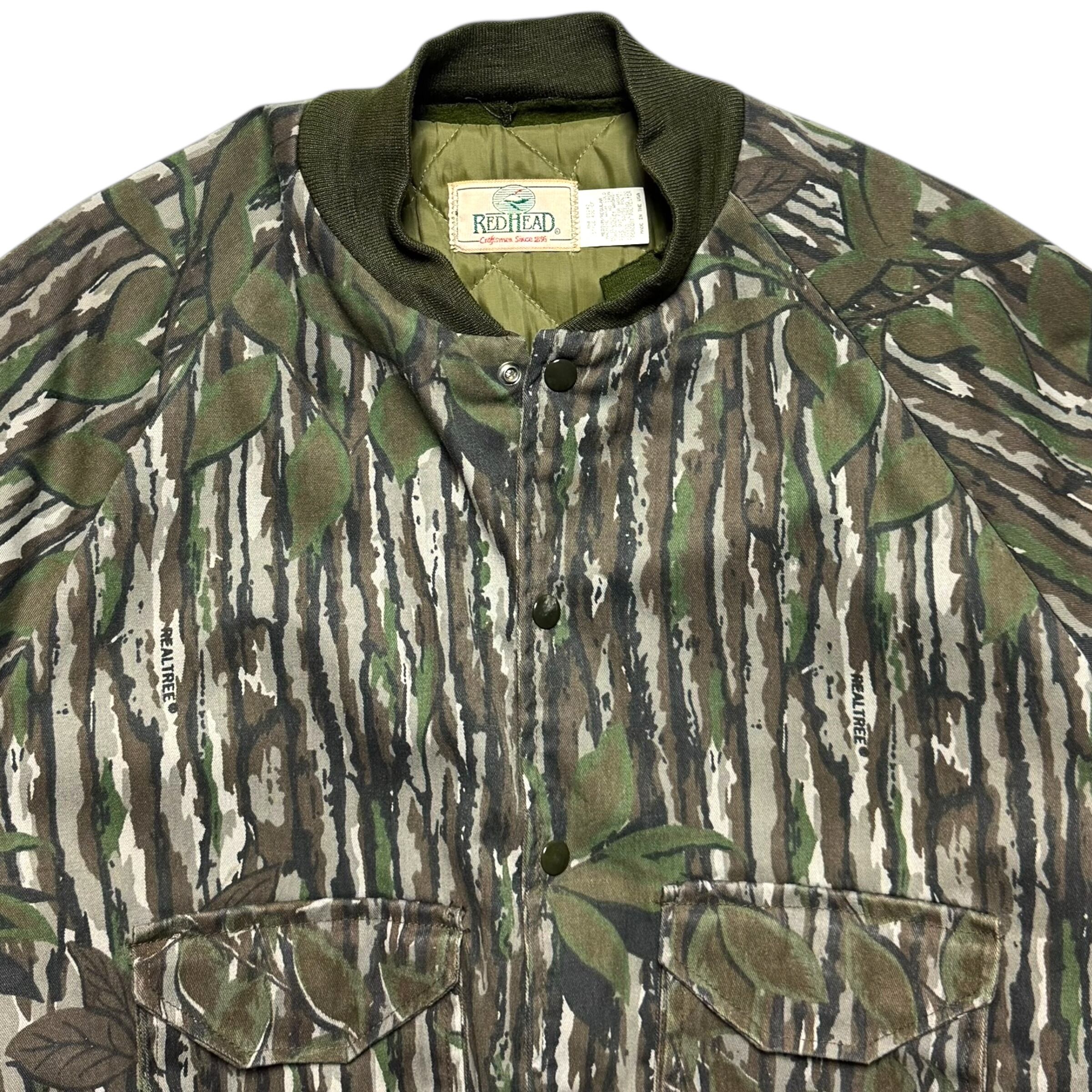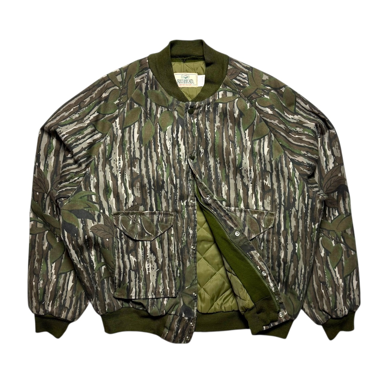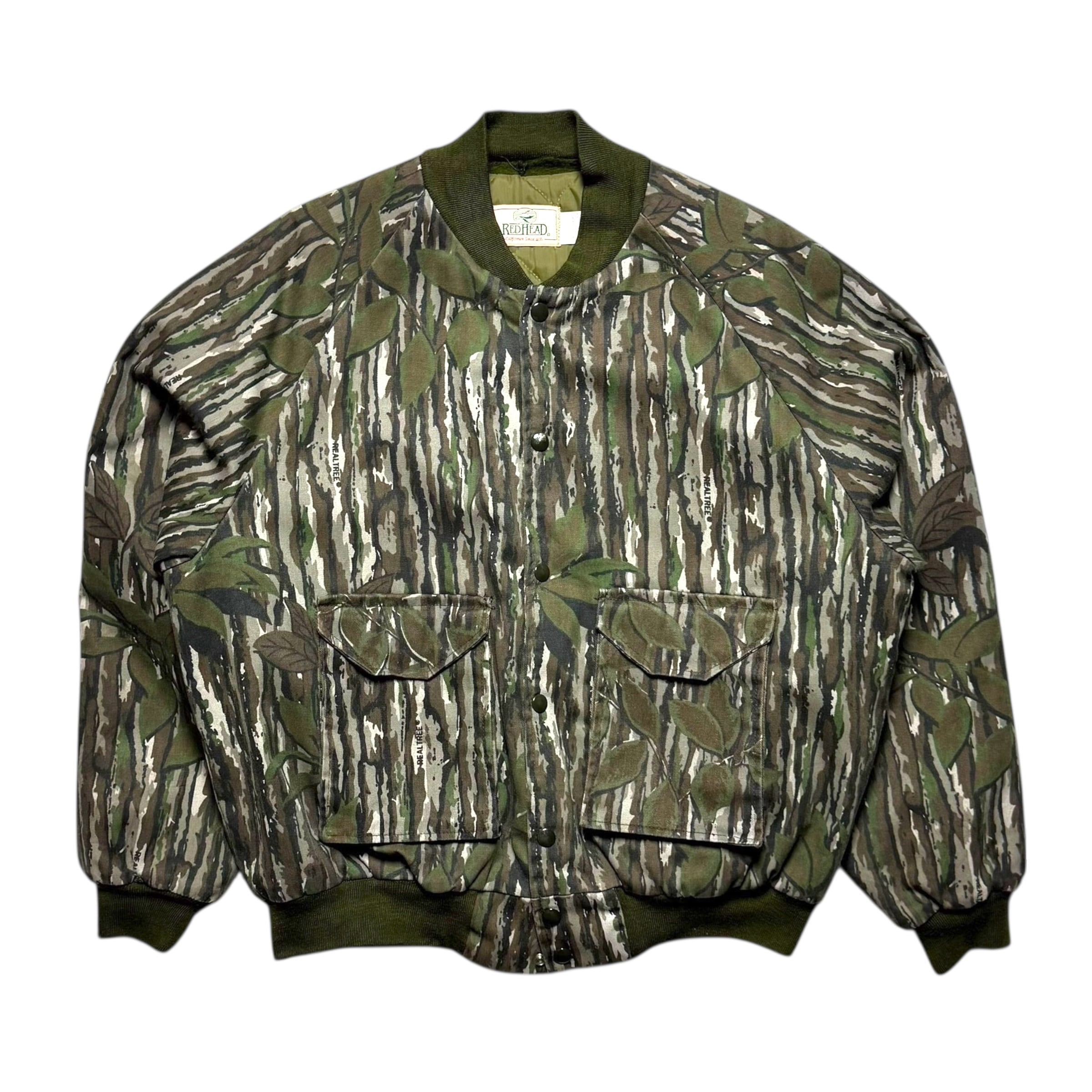 レッドヘッドのリアルツリーカモ柄のボンバージャケット。キルティング裏地、A2型のポケット配置、この手アイテムで珍しいスナップ&ジップ。最高です。冬のお供に是非。